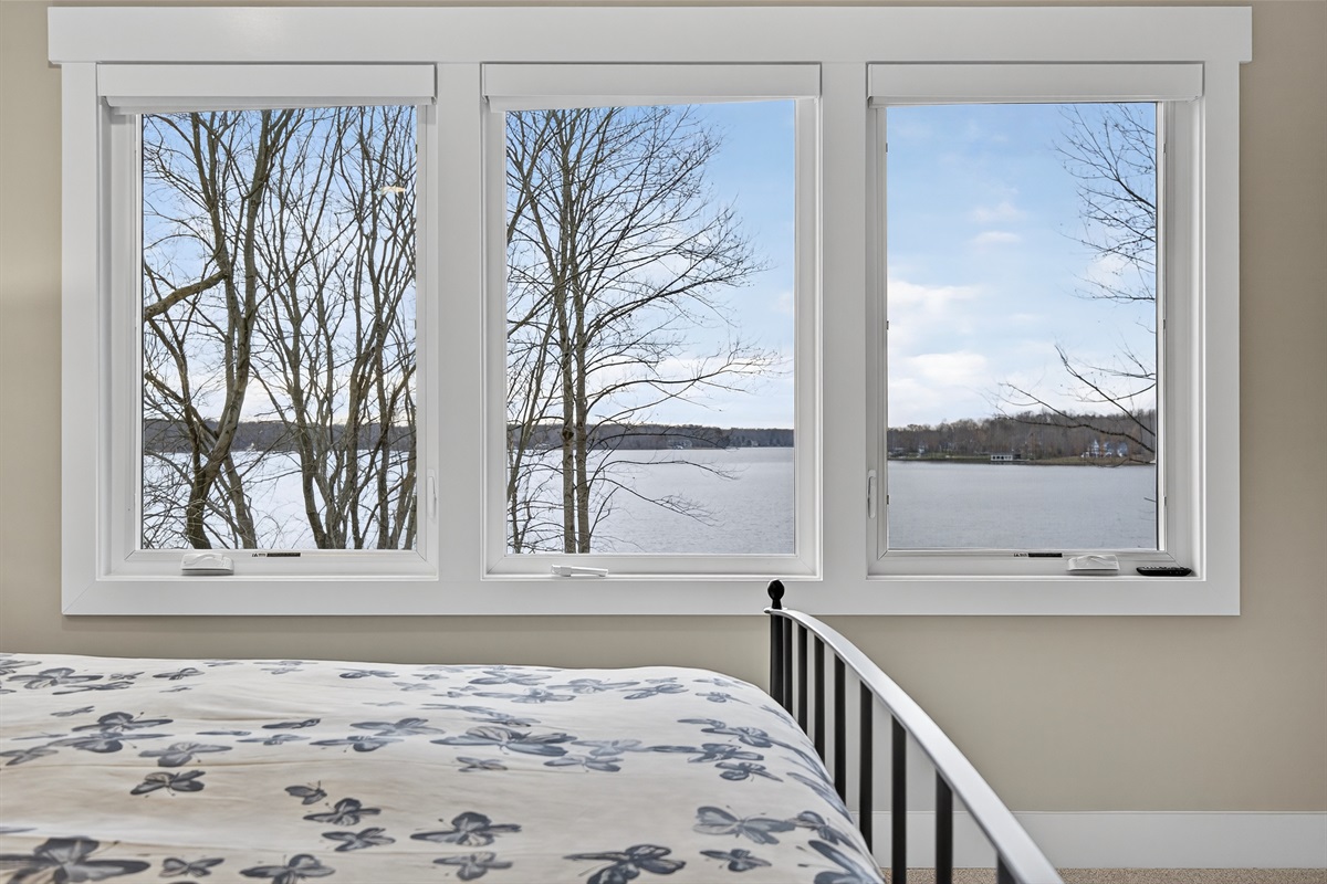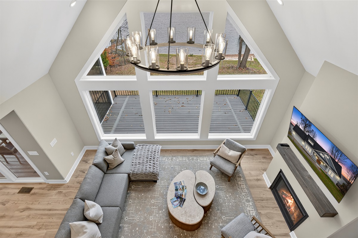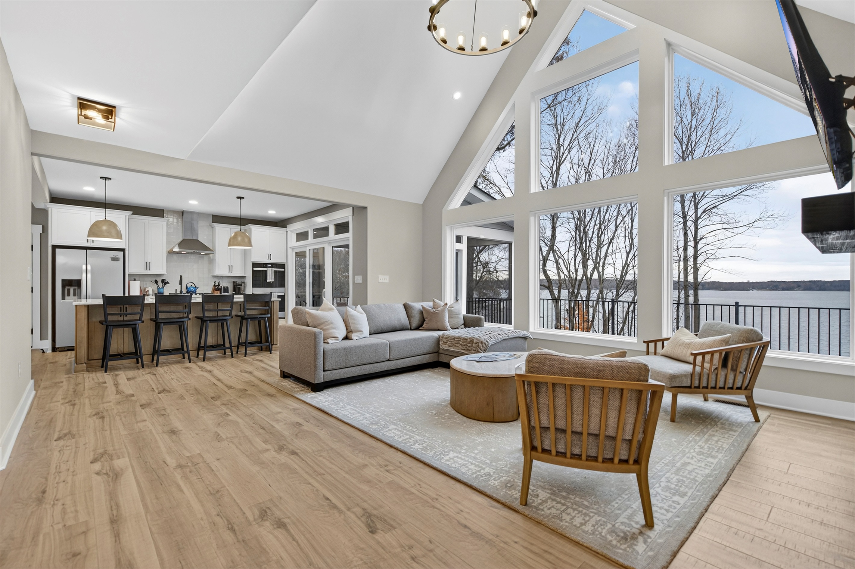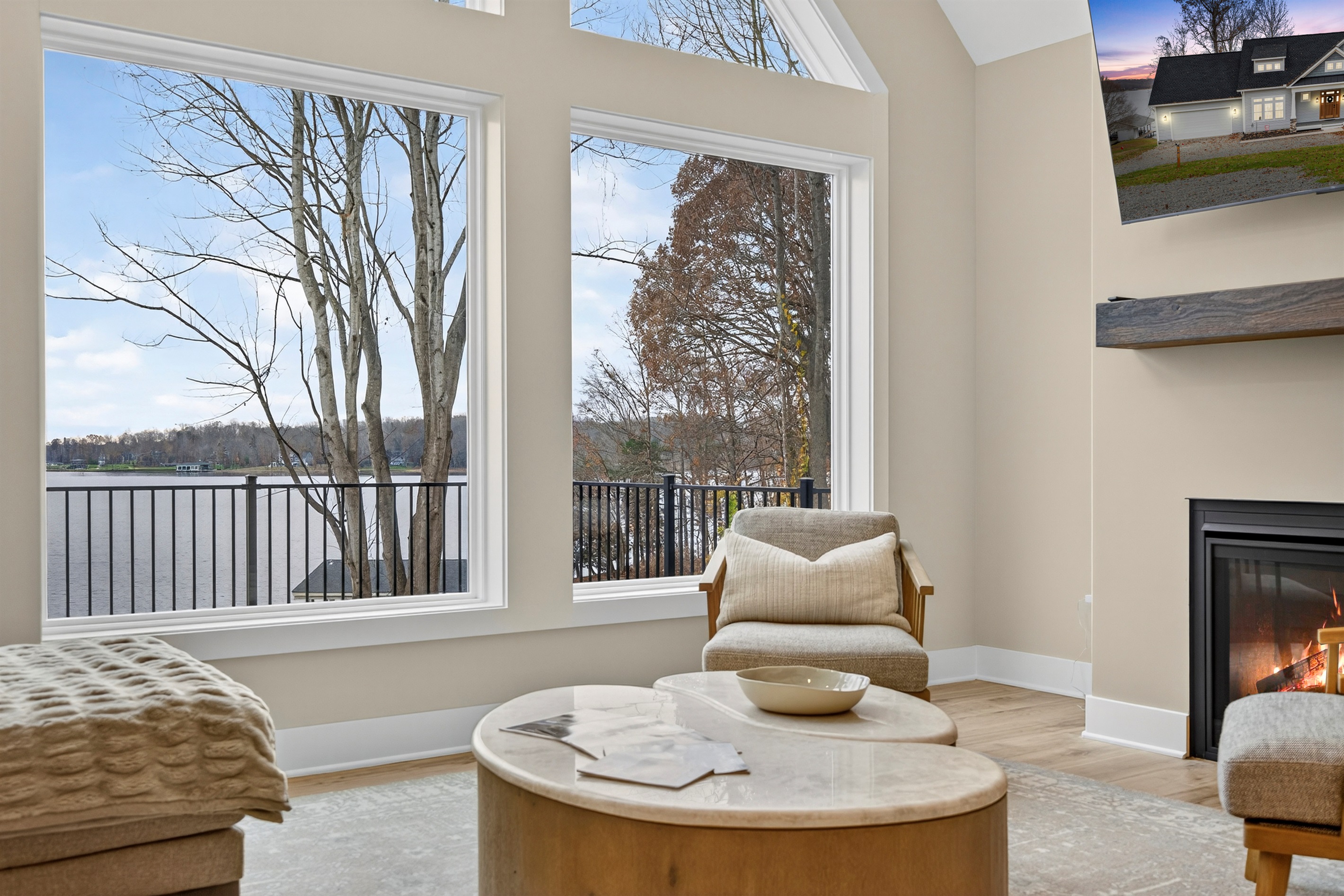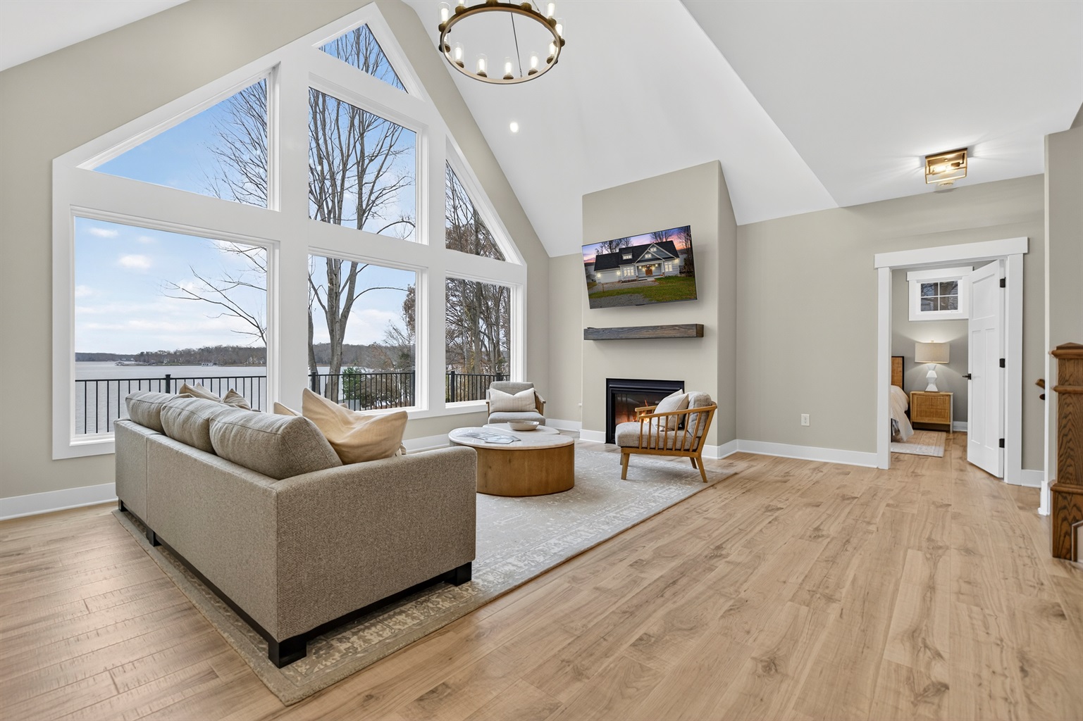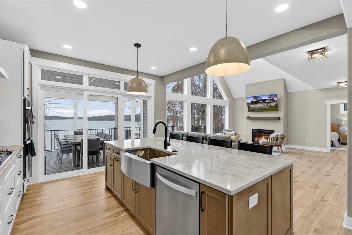 - Main level great room – Lake views, vaulted ceilings, fireplace