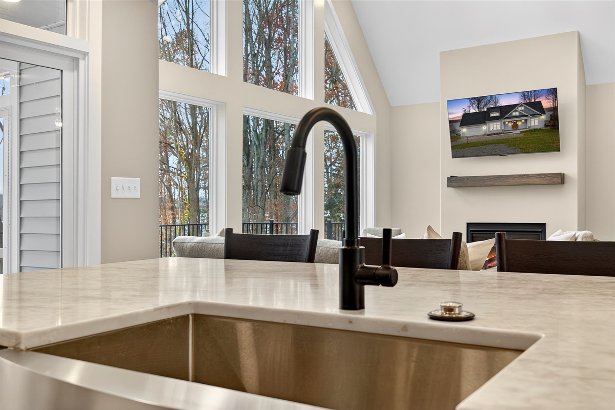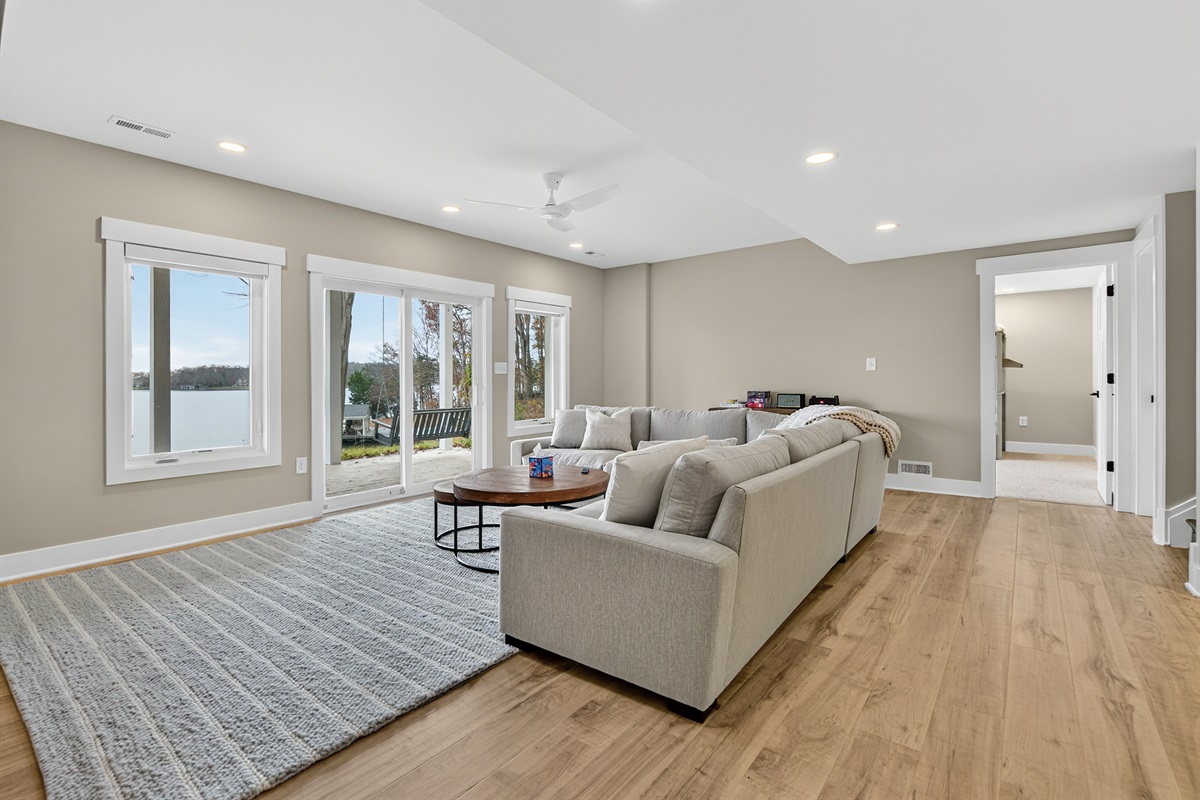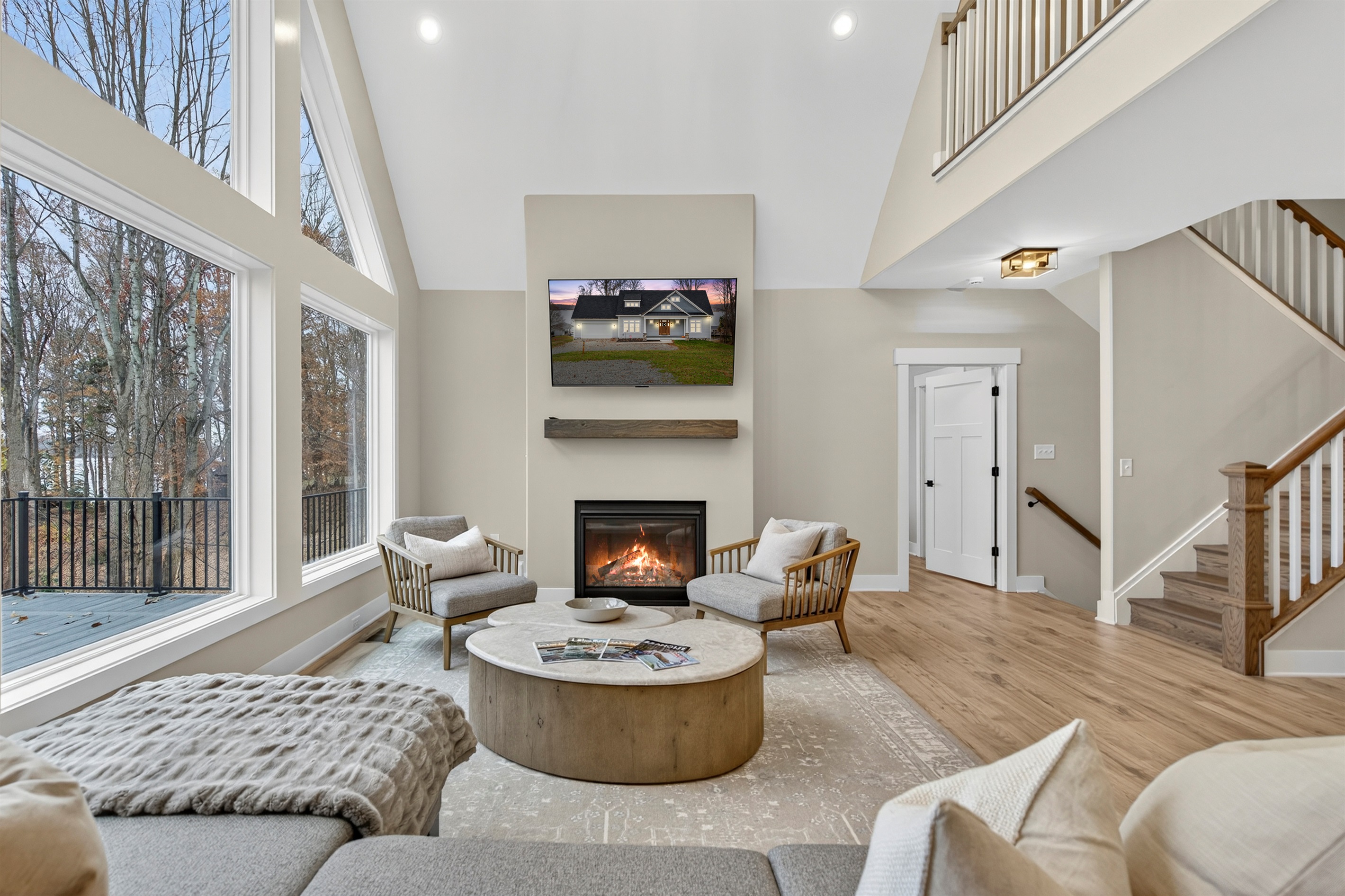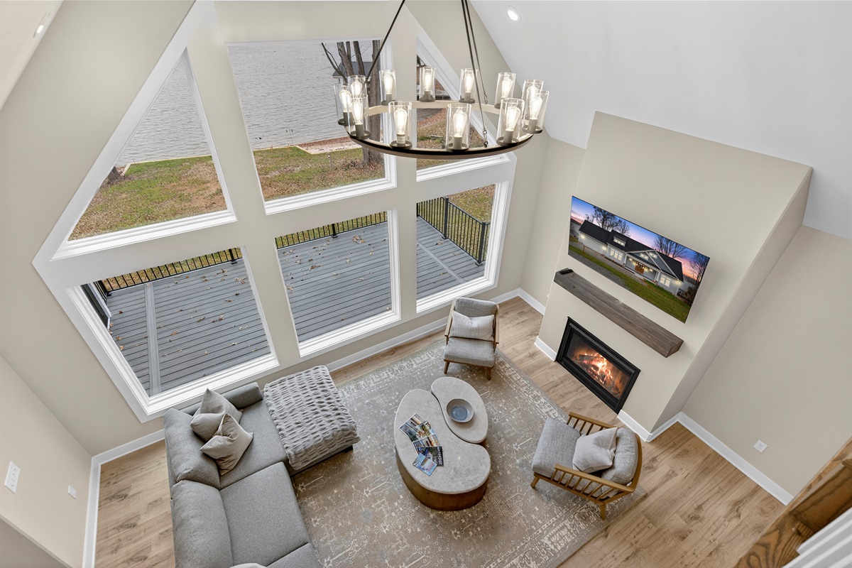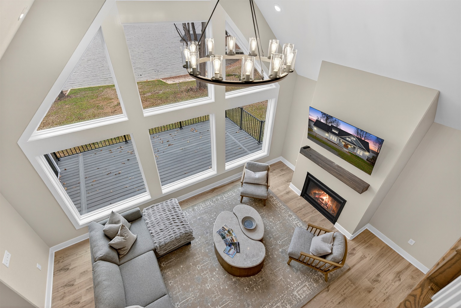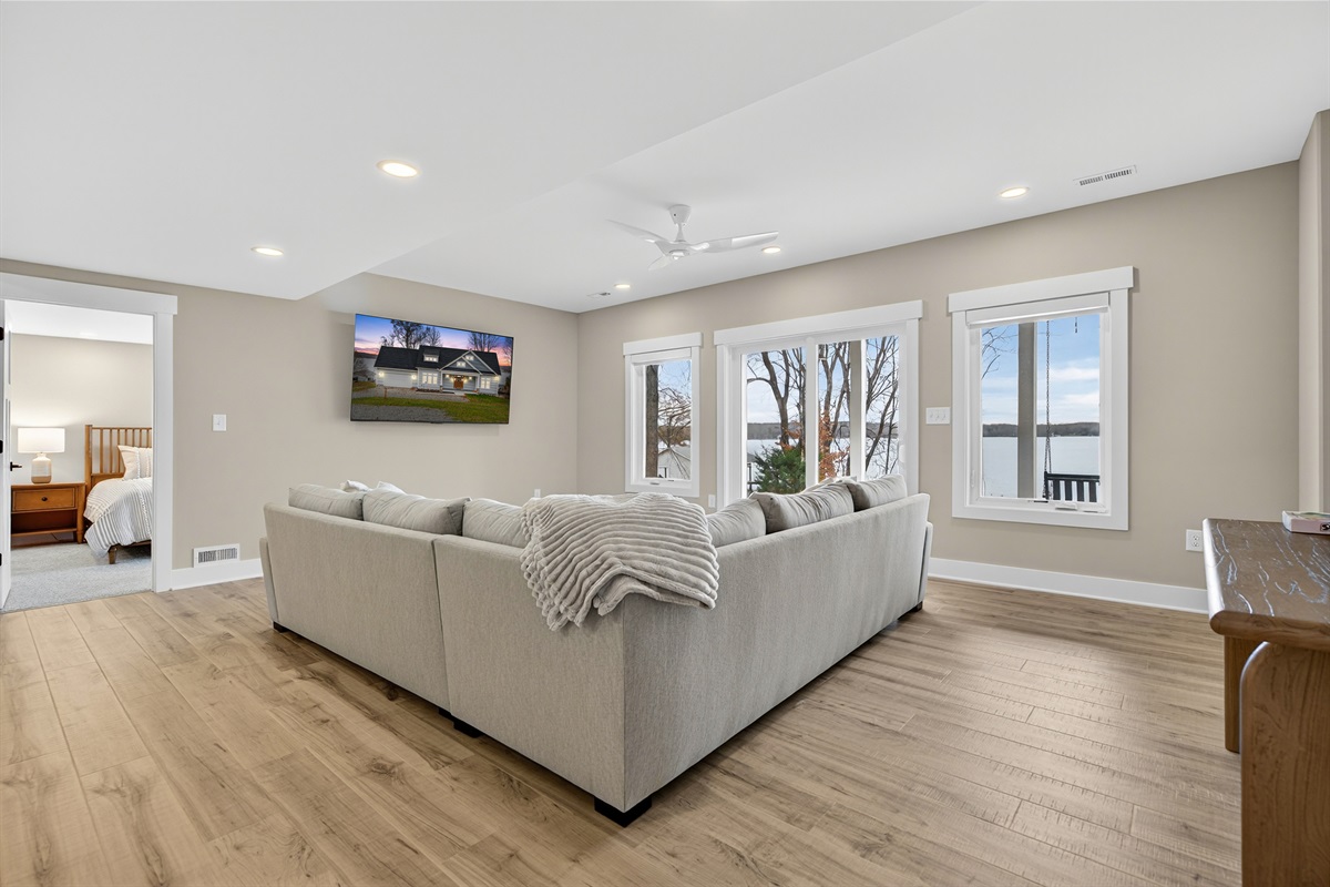 - Main level great room – Lake views, vaulted ceilings, fireplace