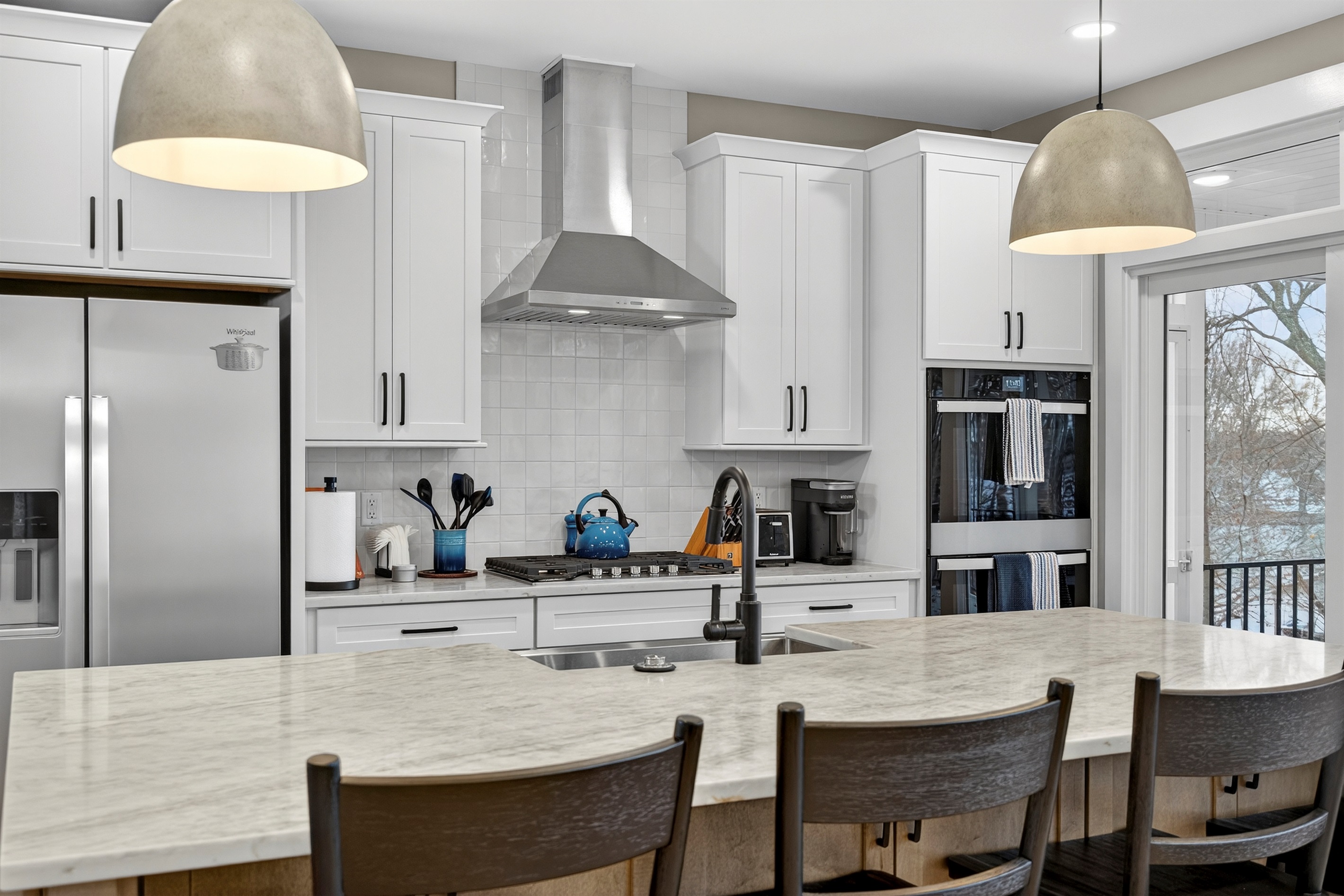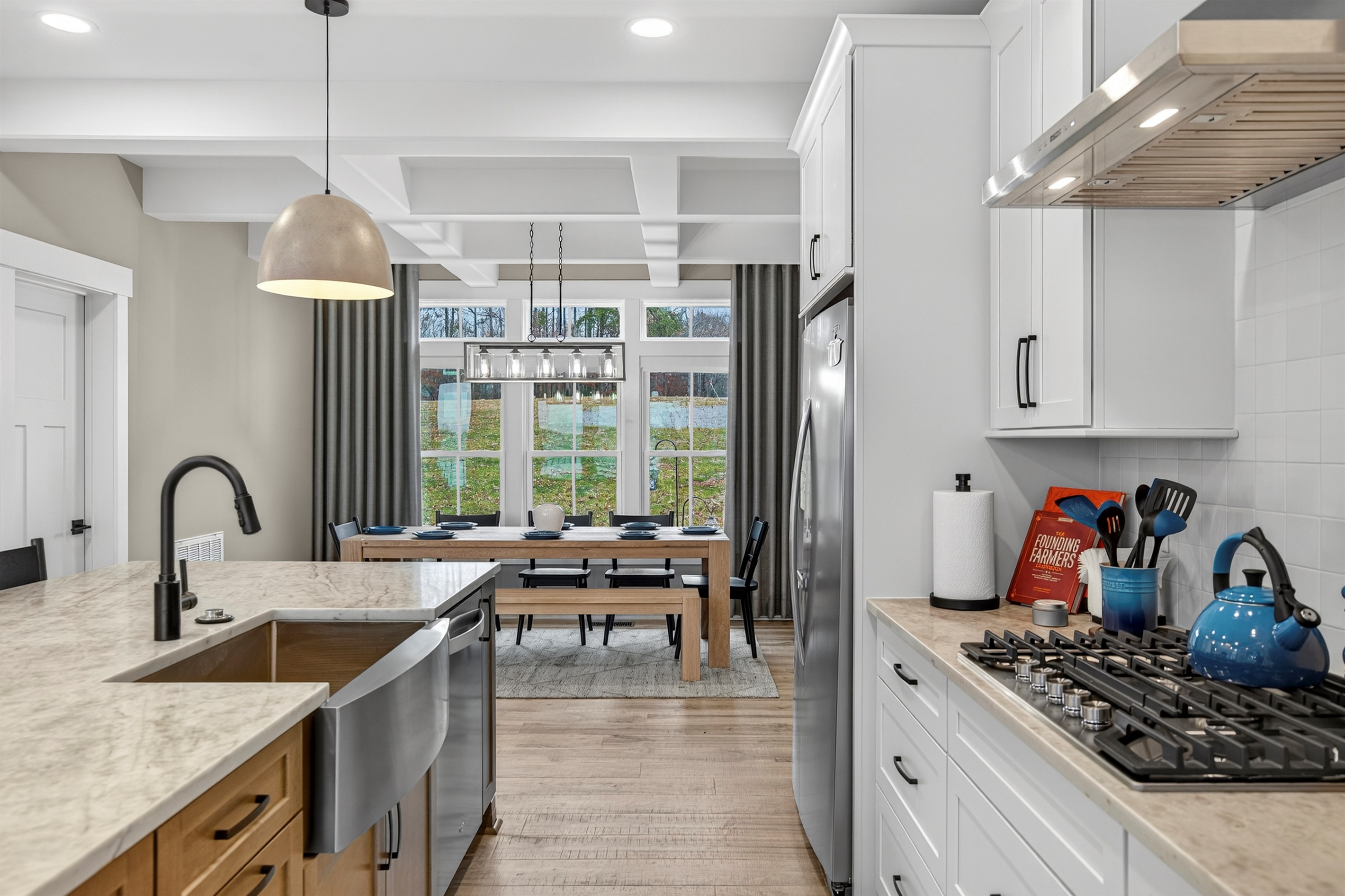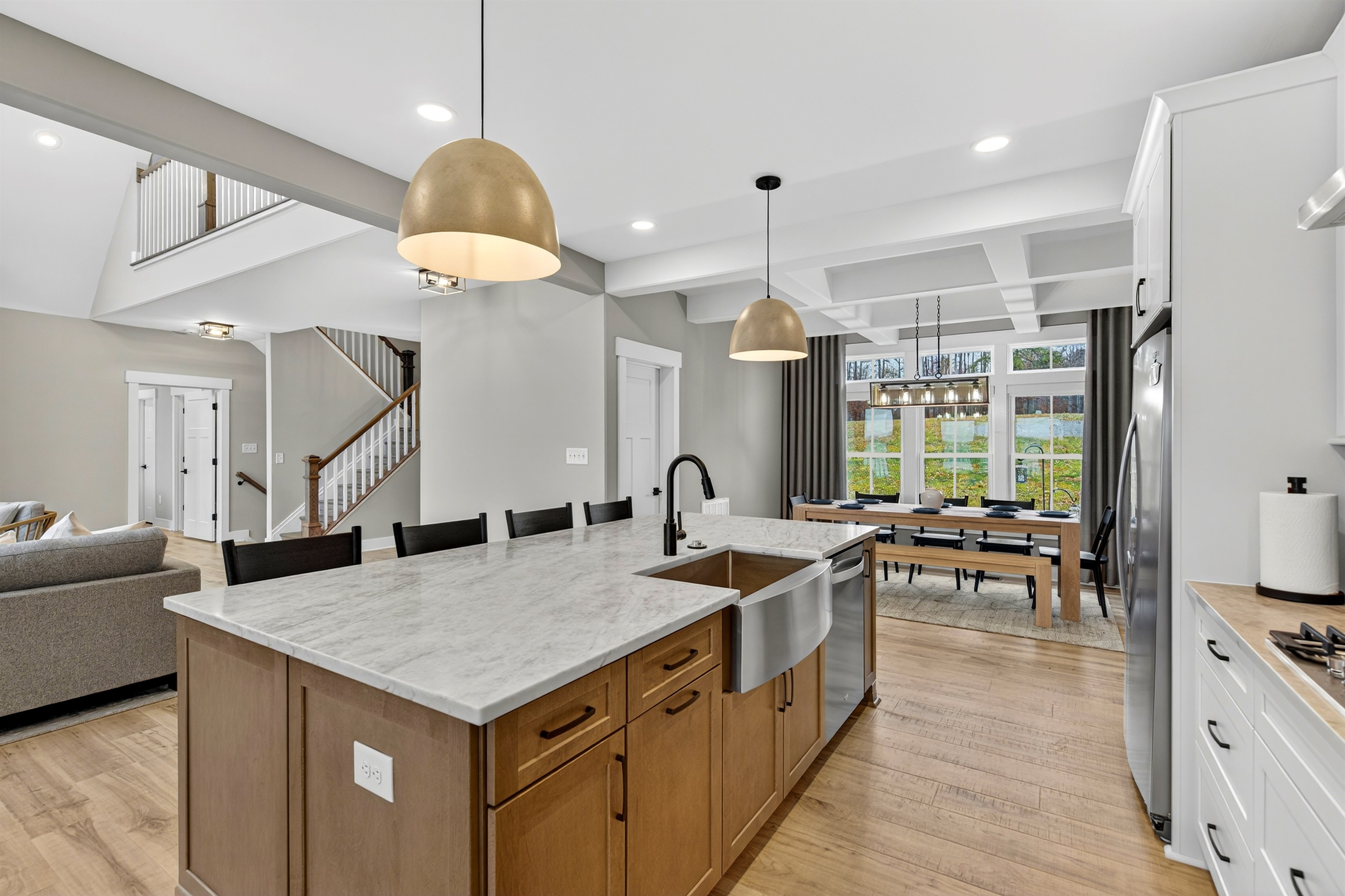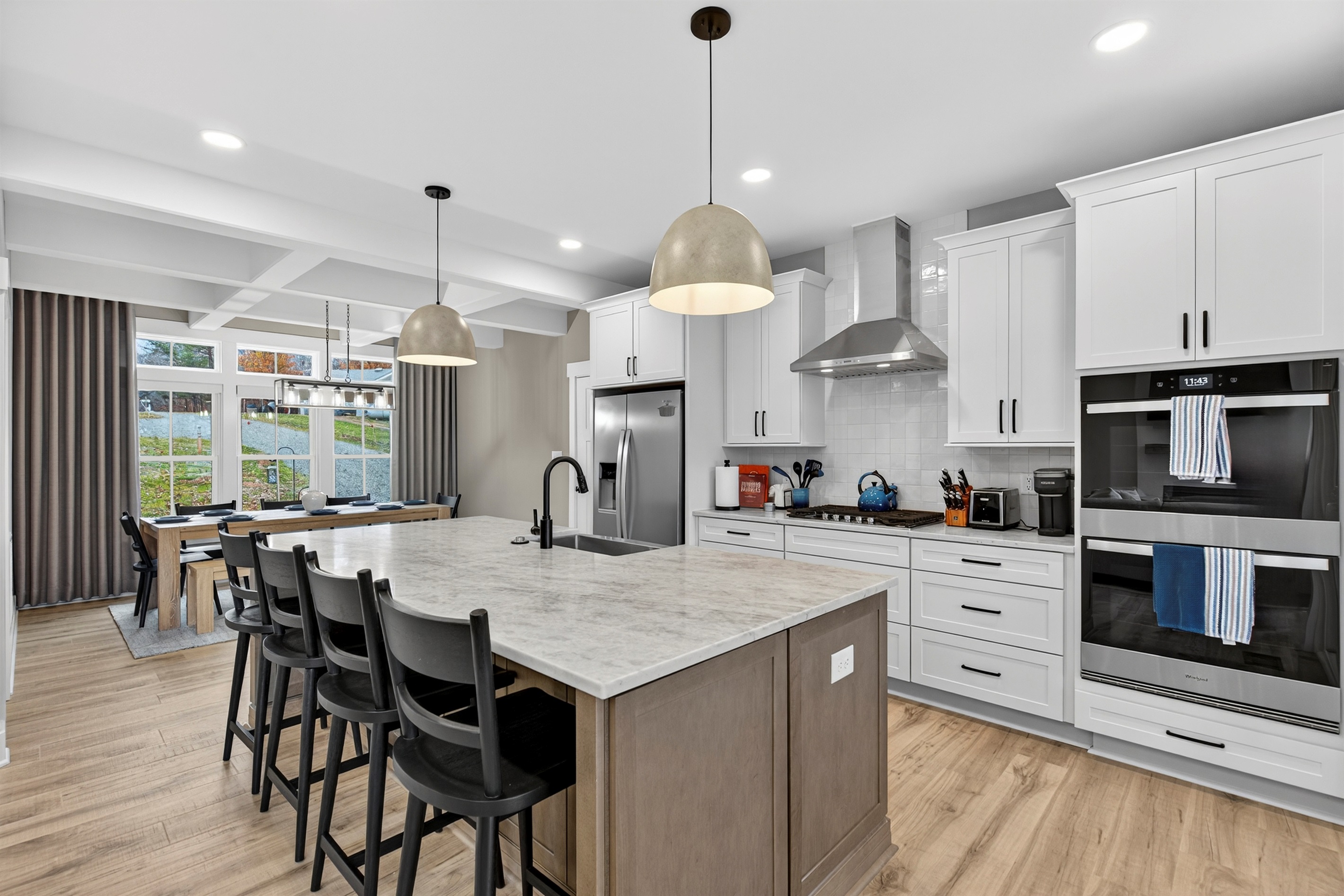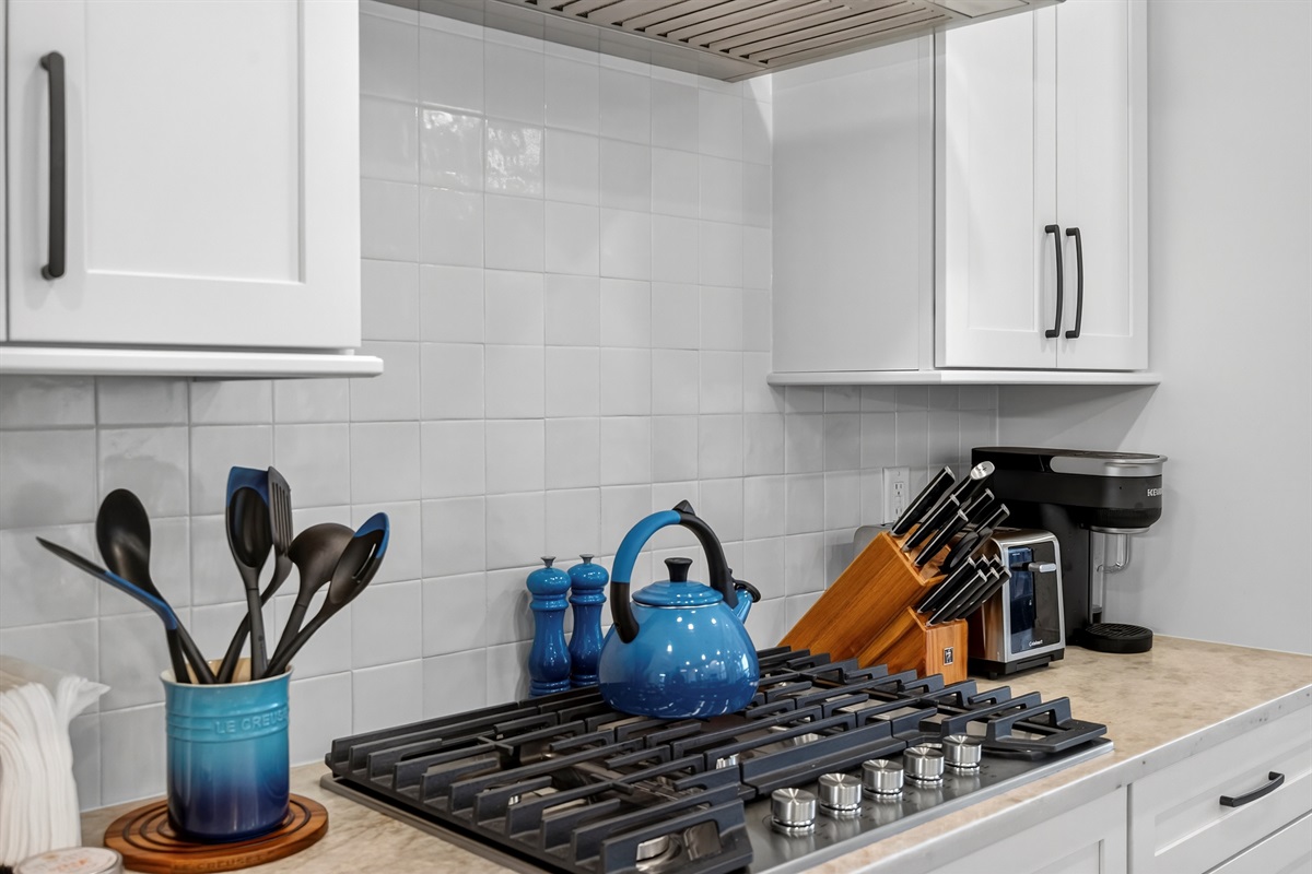 The chef’s kitchen includes an oversized island, stainless steel appliances, Keurig with K-cups, and everything needed for preparing meals. Additional highlights include: