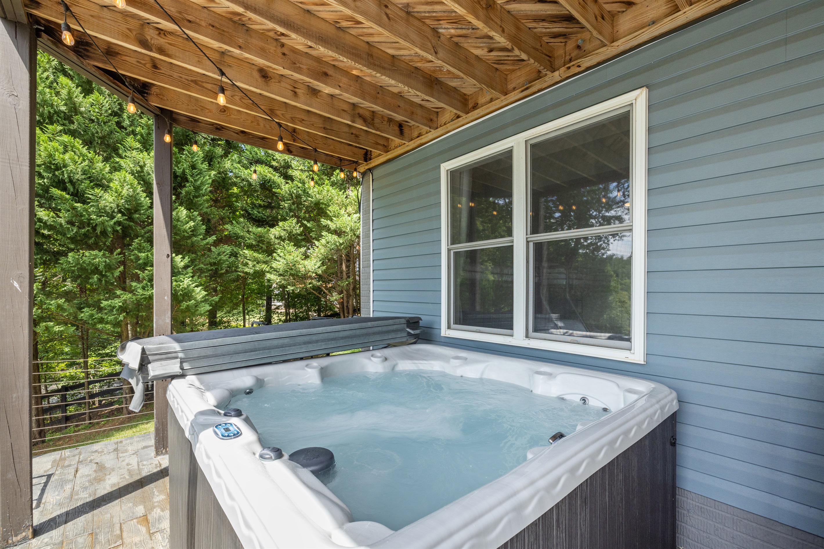 A spacious covered patio with cozy outdoor seating, string lights, and a hot tub, offering a relaxing retreat with scenic views.