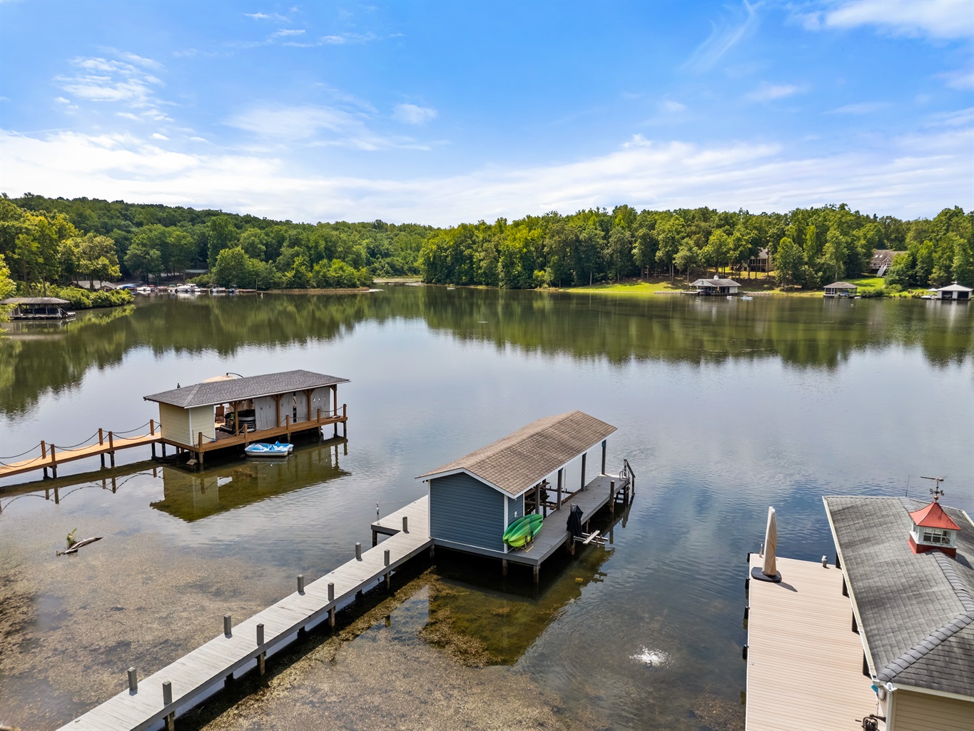 A private boardwalk leading to a covered dock on a peaceful lake, surrounded by lush greenery and offering a serene retreat.