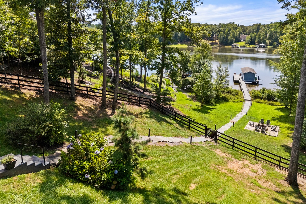A picturesque lakefront property featuring a serene dock, lush greenery, and a cozy fire pit, perfect for relaxation and outdoor enjoyment.