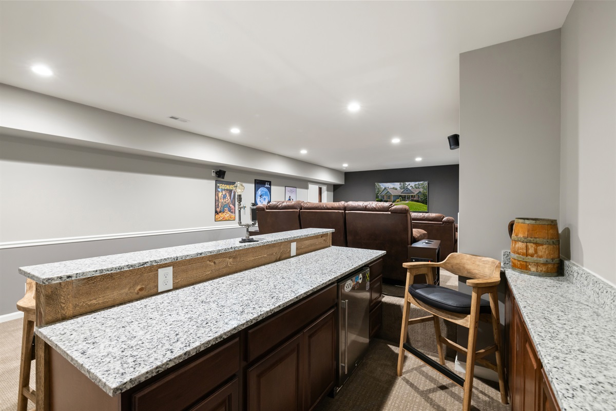 A cozy home theater with tiered seating, plush recliners, and a convenient bar area, perfect for movie nights and entertaining guests.